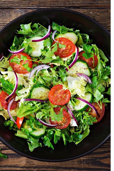 "Fresh lettuce, tomatoes, cucumbers, and bell peppers, dressed with a light vinaigrette. A simple, refreshing choice!"