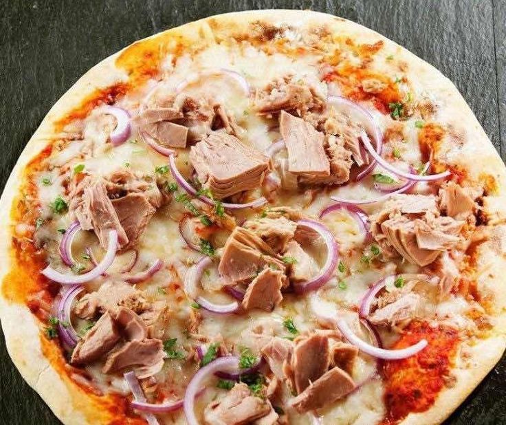 "Fresh tuna, tangy tomato sauce, and melted cheese. A seafood classic!"