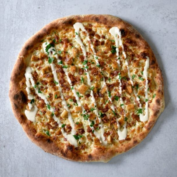 "Grilled chicken, creamy ranch sauce, and fresh veggies on a cheesy crust. A ranch-style favorite!"