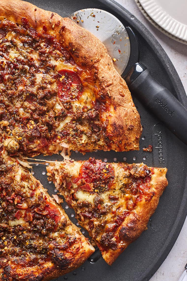"Loaded with minced beef, salami, and pastrami on a cheesy base. For the ultimate meat enthusiast!"